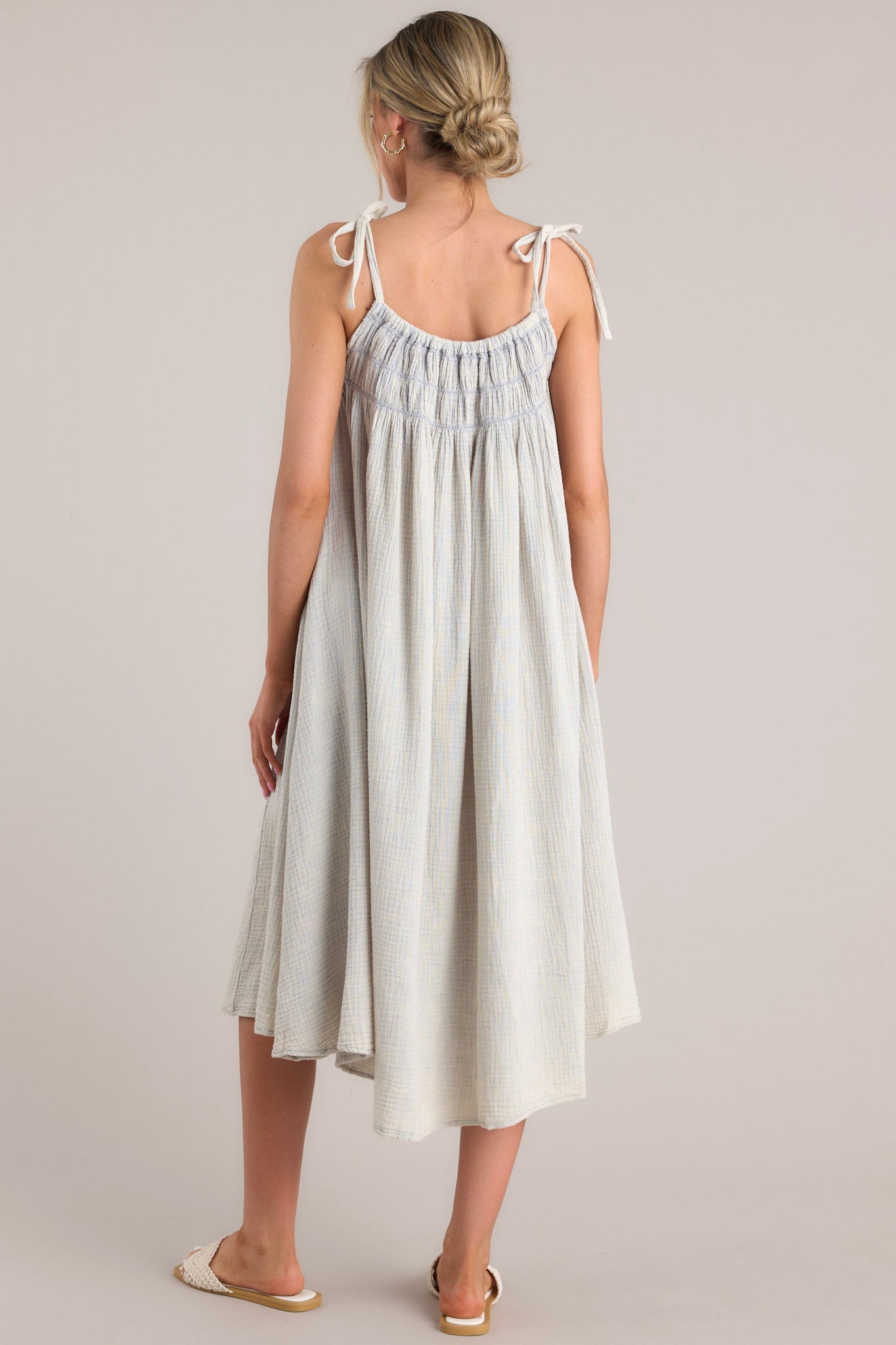 Don't wait to make a statement with this First Things First Light Blue Midi Dress! Show your fashion prowess with this one-of-a-kind dress. Not to mention that the midi length provides a chic and timeless look! Get your hands on this eye-catching dress and be the envy of all! This dress features a square neckline, a smocked bust, self-tie straps, waist pockets, and a linen like material.