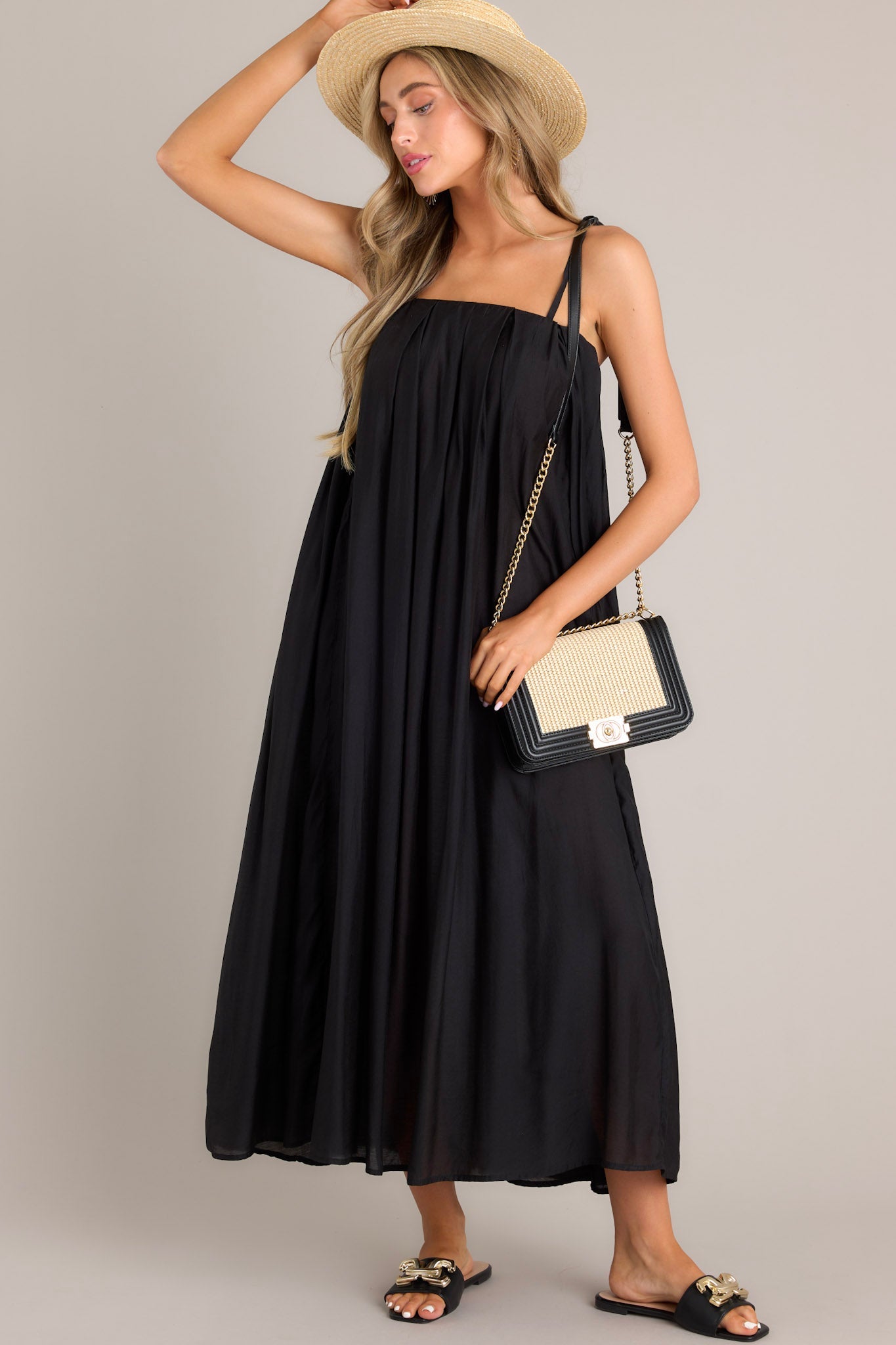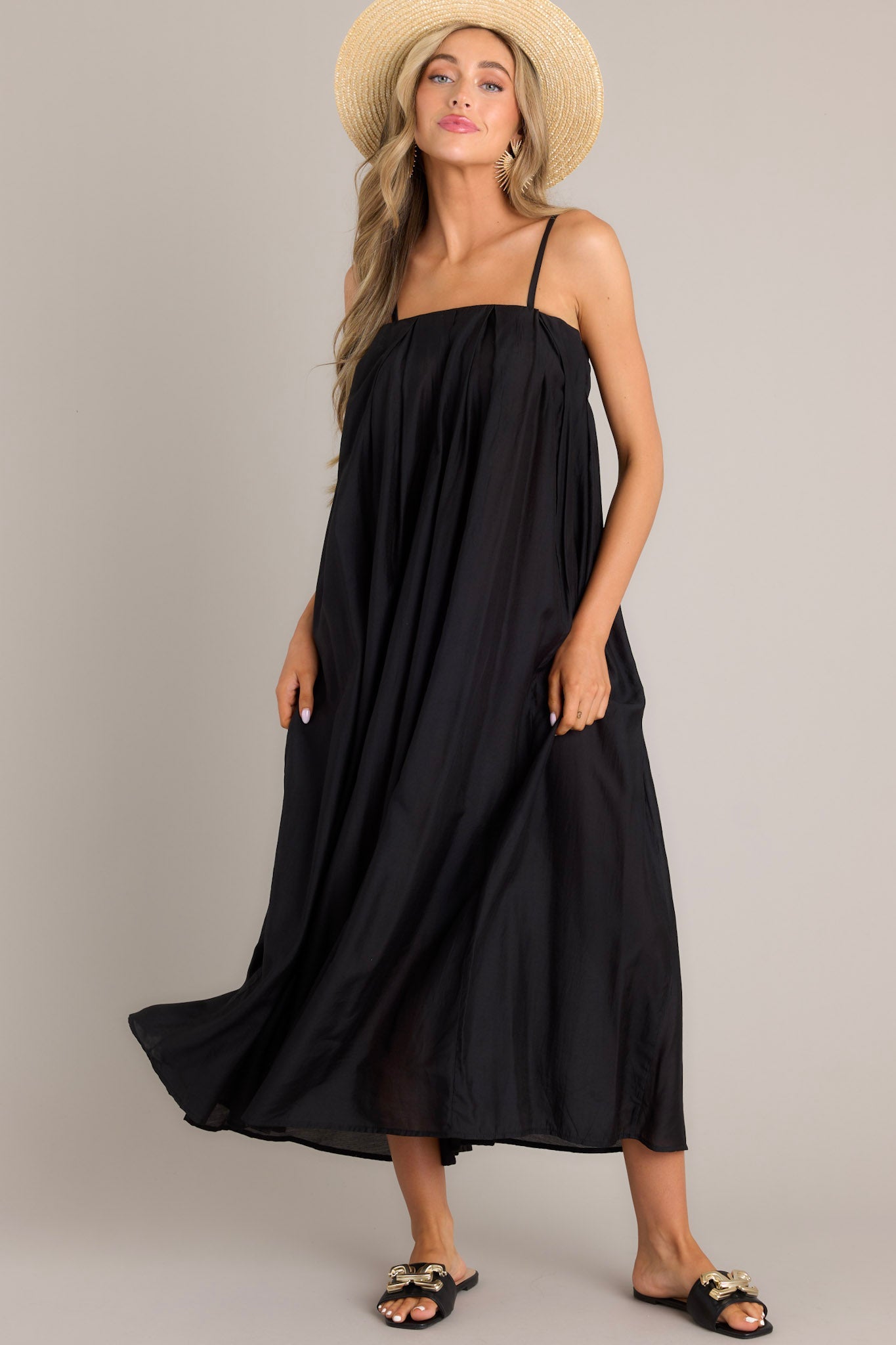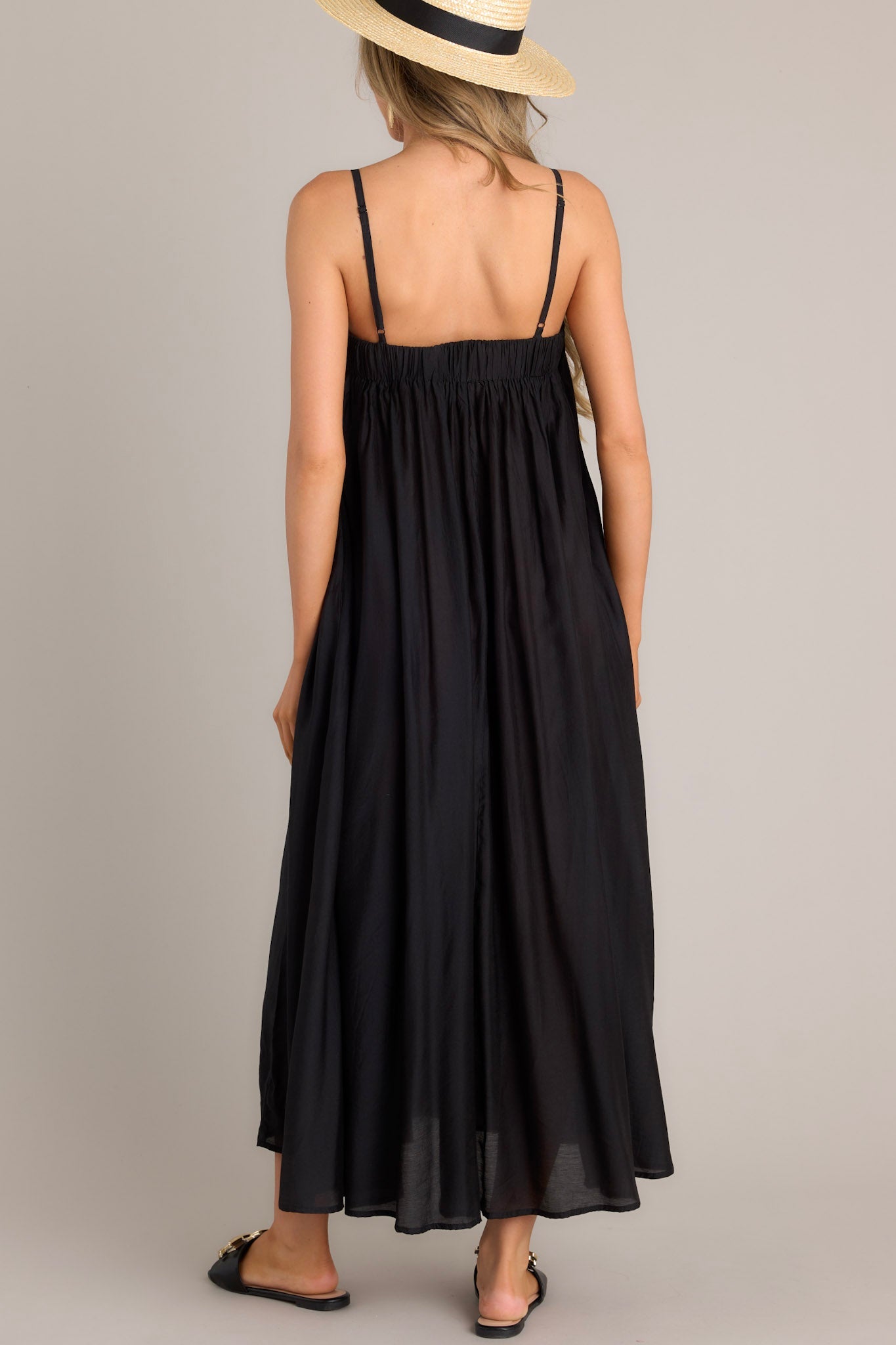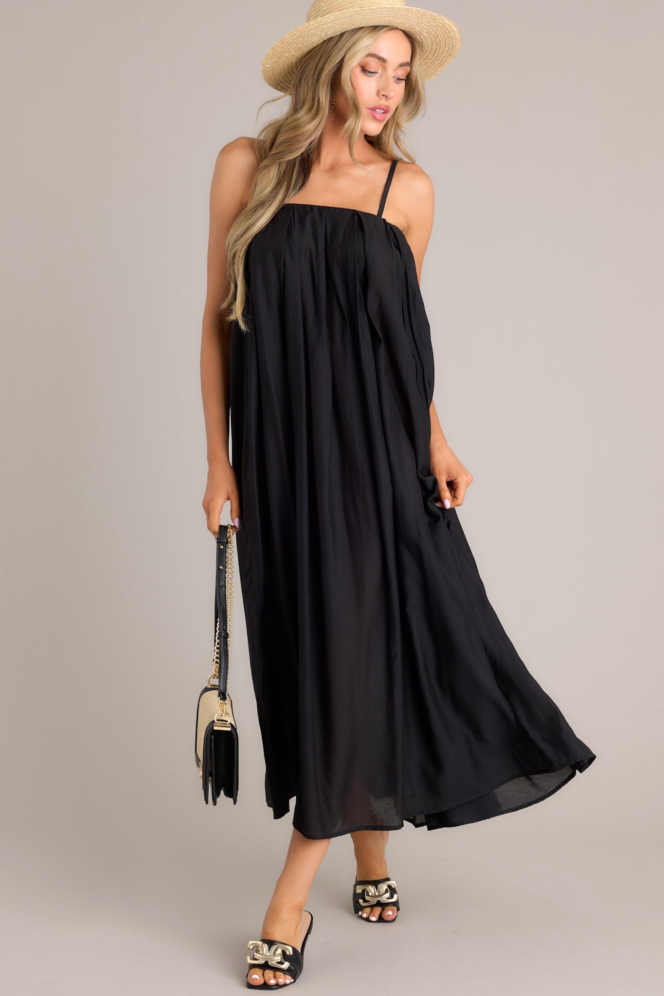 Need the perfect dress for your next summer event? Look no further than I Need Somebody Black Maxi Dress! With its flowy design and stunning color, you'll be sure to turn heads. Perfect for a day out or a night on the town, this dress will have you feeling confident and stylish. So why wait? Grab yours now! This dress features a square neckline with an elastic insert in the back, thin adjustable straps, and functional pockets.