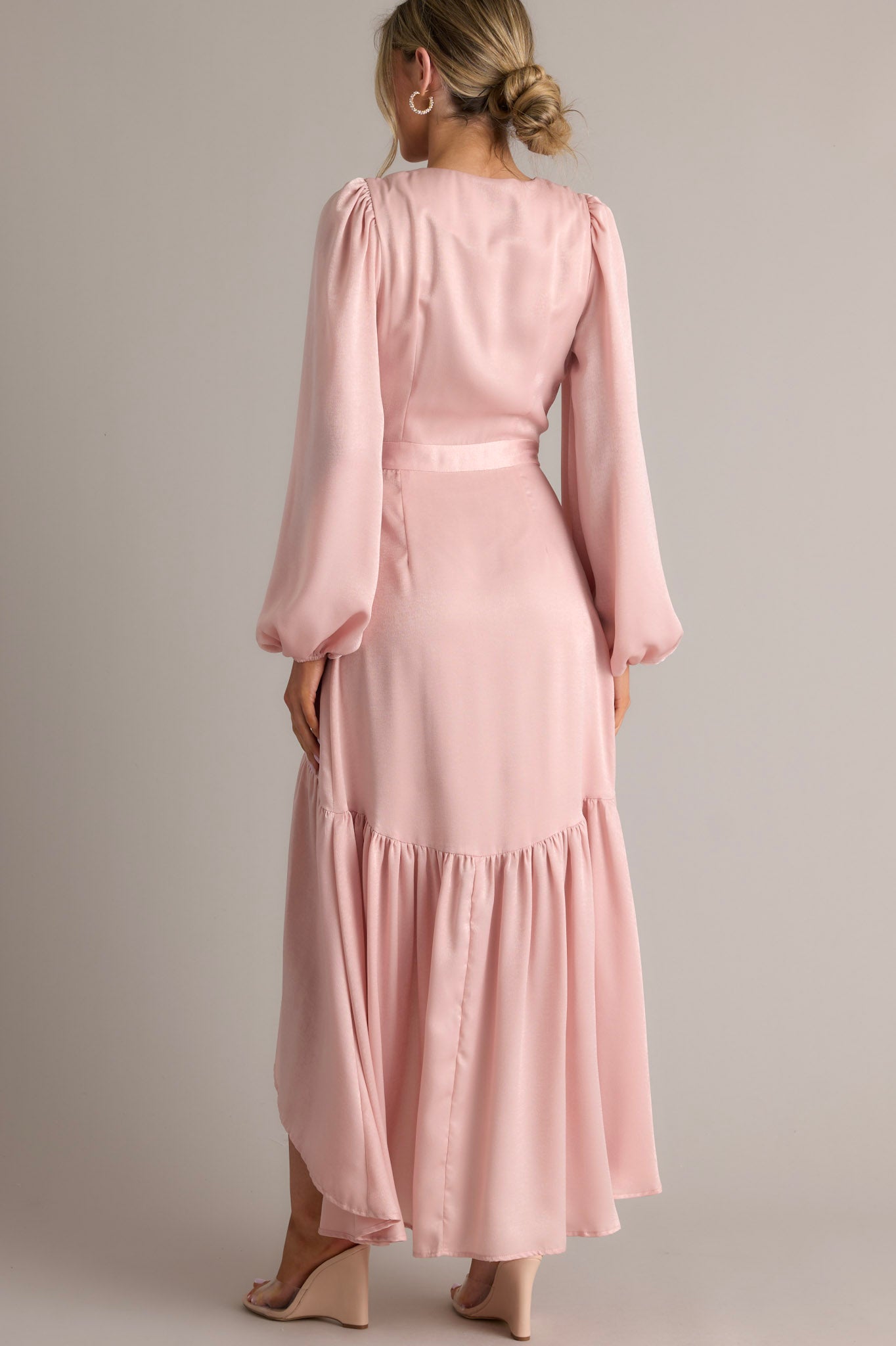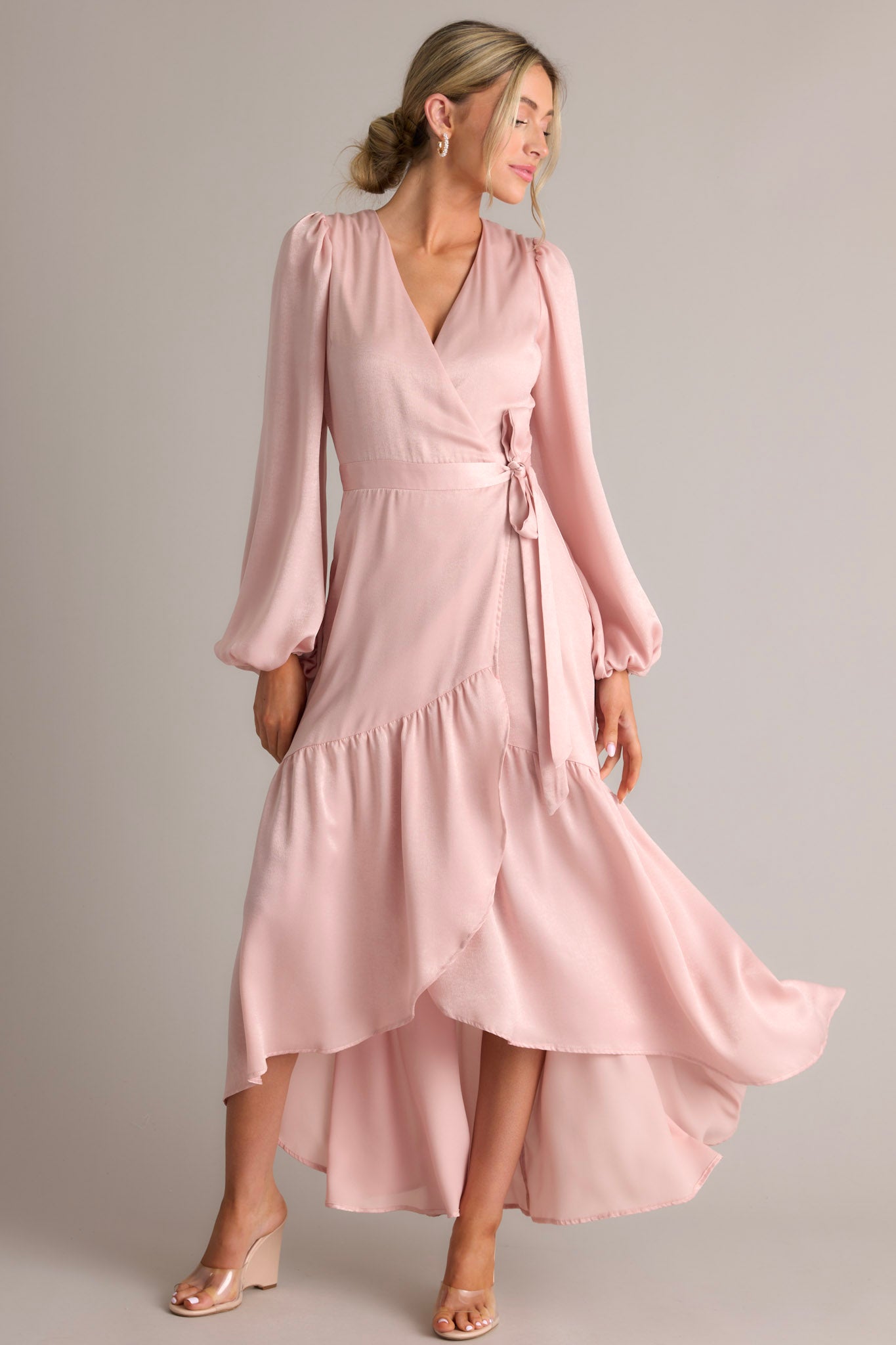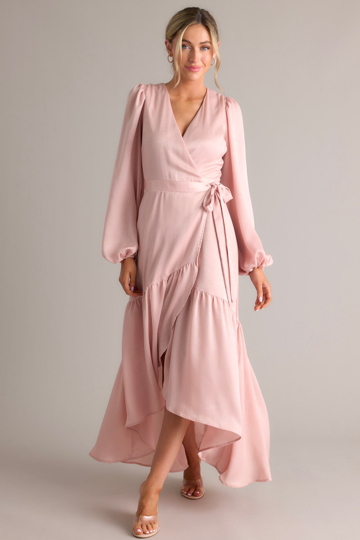 Let's face it, You Enchant Me and everyone in the room in this elegant wrap dress. This look will even have everyone under your spell! We adore this charming glow on you, for sure! This wrap dress features a v-neckline, balloon sleeves, an adjustable tie around the waist, and an asymmetrical flowy skirt.