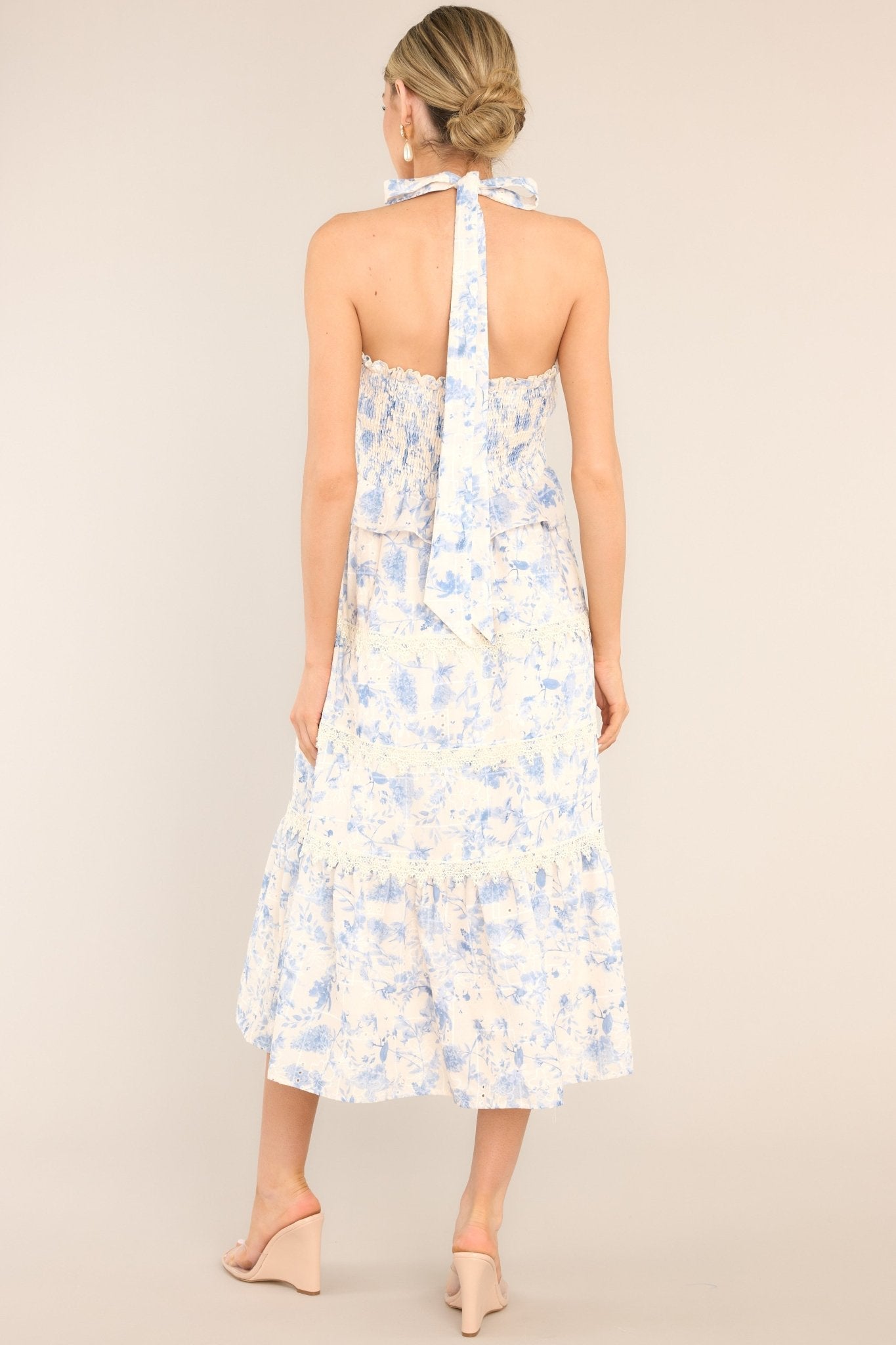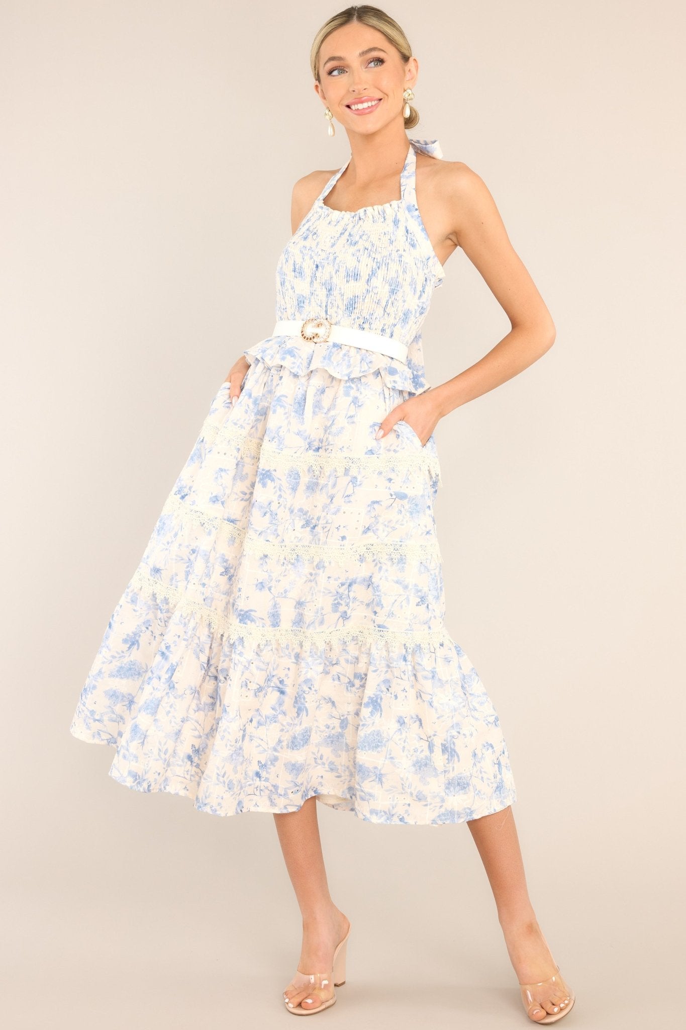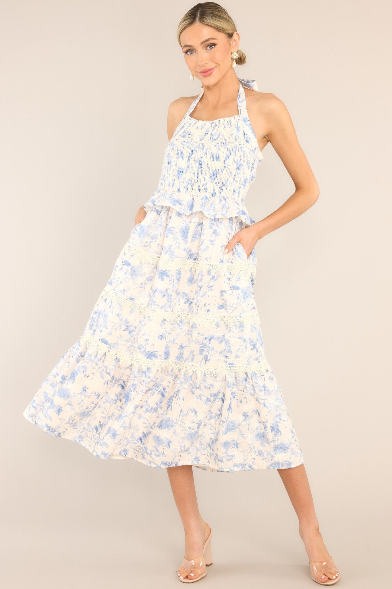 Unleash your inner power with the Power Inside Me Blue & Ivory Midi Dress. With its vibrant blue and ivory colors, this dress will make you stand out in any crowd. Its unique design and comfortable fit will have you feeling confident and unstoppable. This dress is a must-have for your wardrobe. It's time to let your power shine through! This dress features a halter neckline with a self-tie feature at the back of the neck, a fully smocked bodice, ruffle detailing, hip pockets, lace tiers, and a floral pattern.