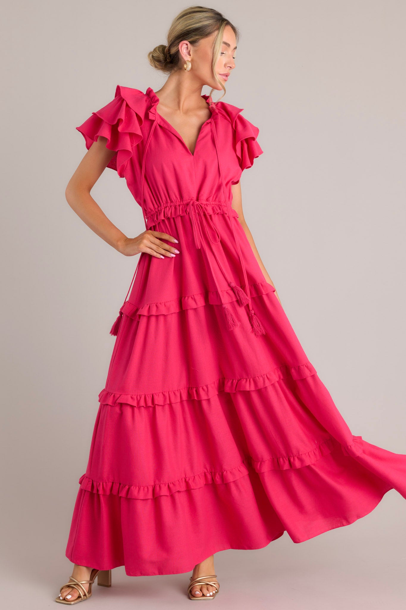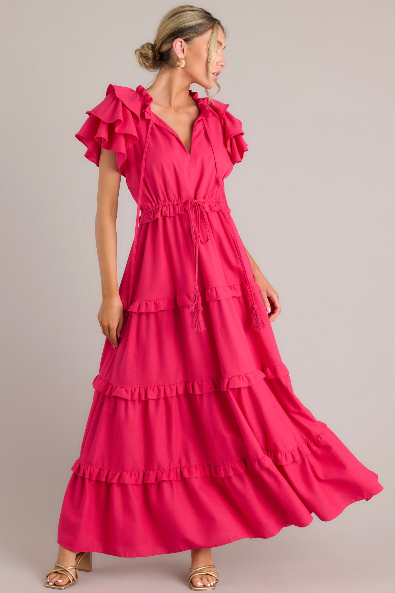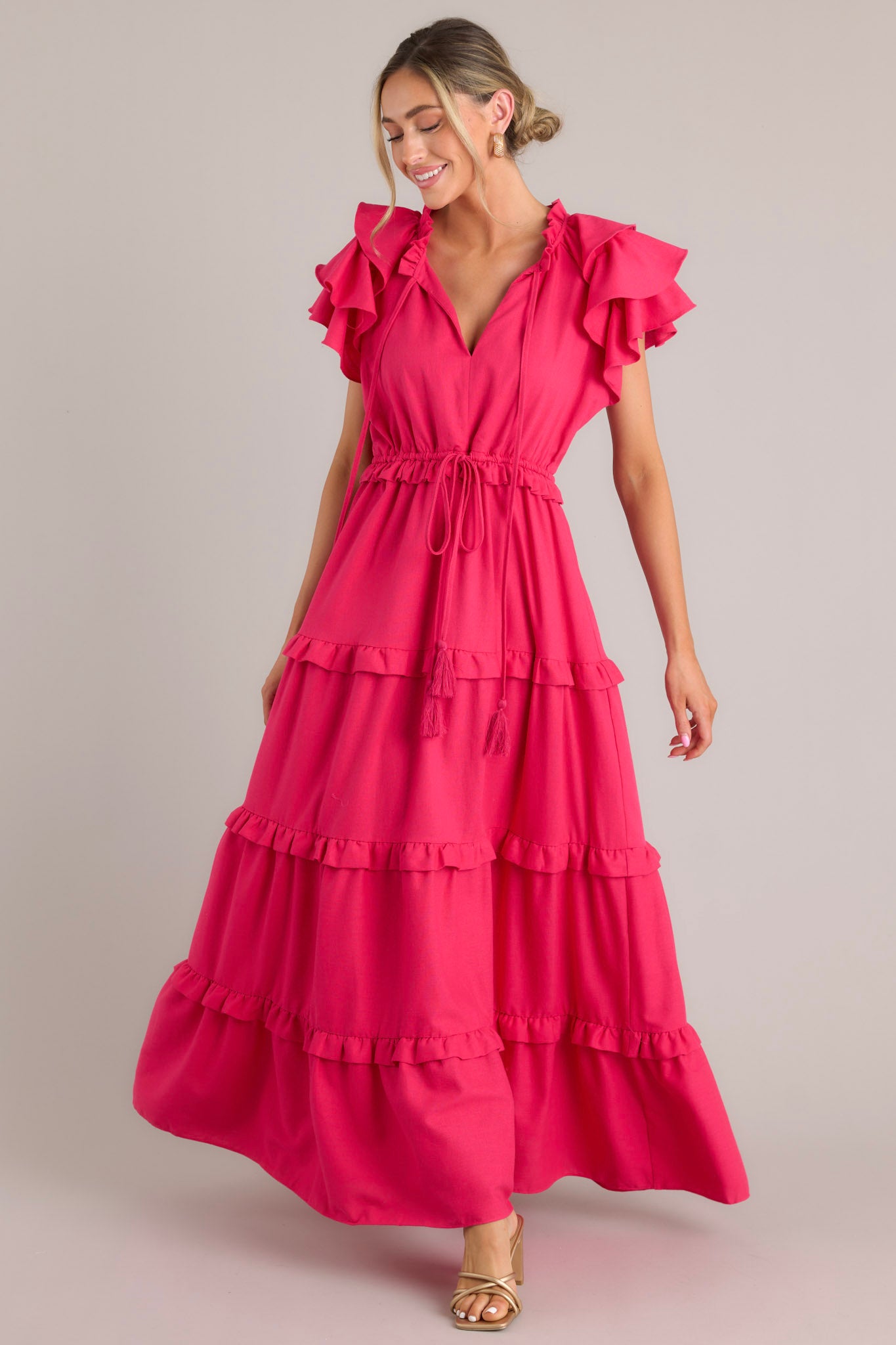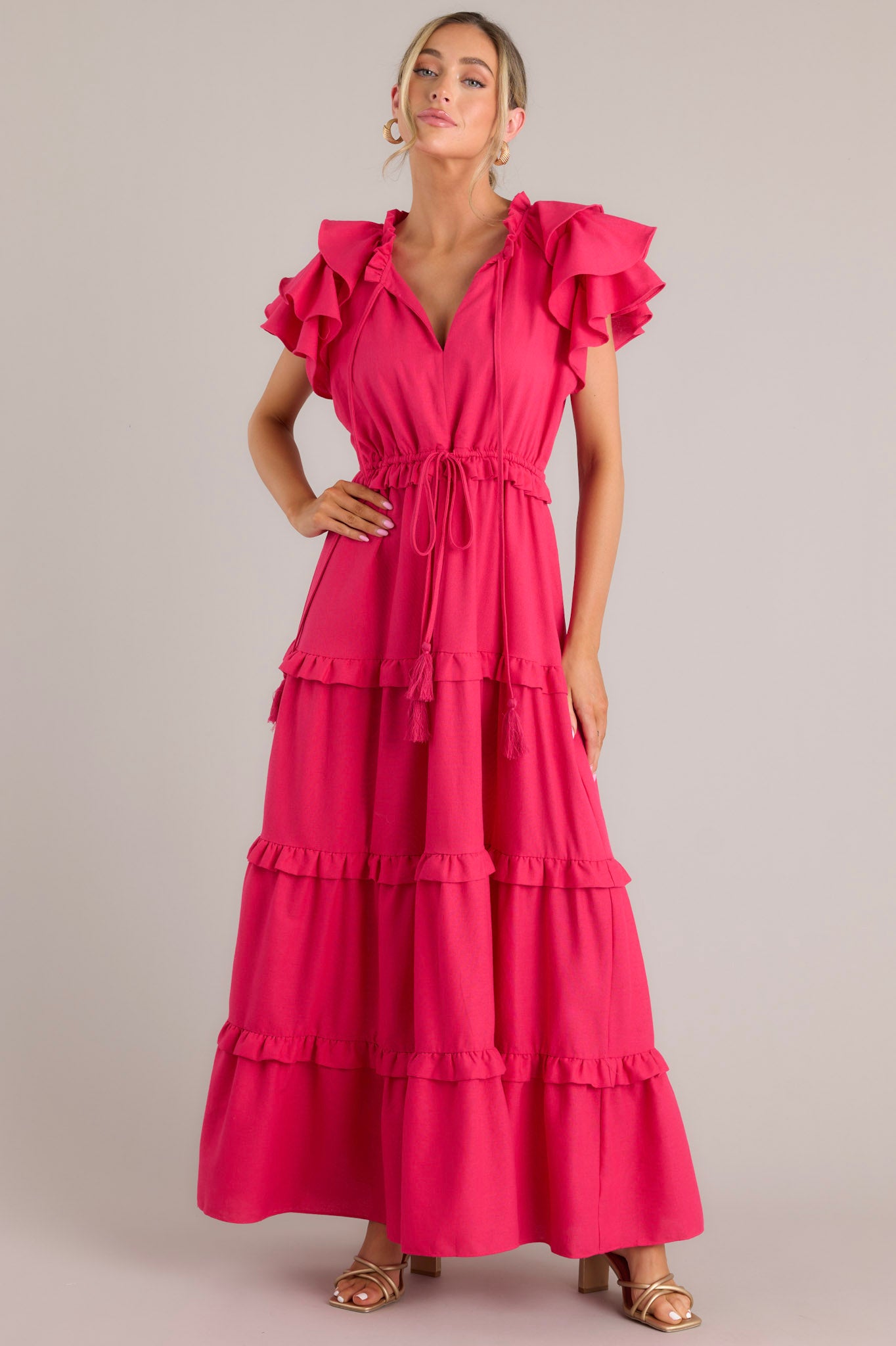 Slip into this Ruffle Some Feathers Lipstick Pink Maxi Dress and turn heads! Flowy and flirty, you'll be the life of the party, while still maintaining an air of elegance and grace. A statement piece sure to impress - it's time to get fluttering! This dress features a v-neckline with a self-tie closure, ruffled flutter sleeves, a drawstring waistband, and a long, flowy skirt. Model is wearing a small.
