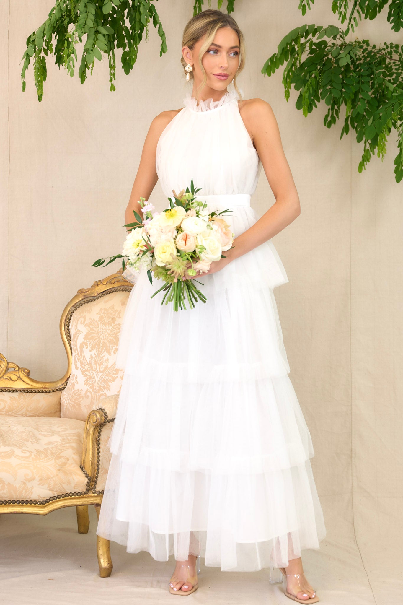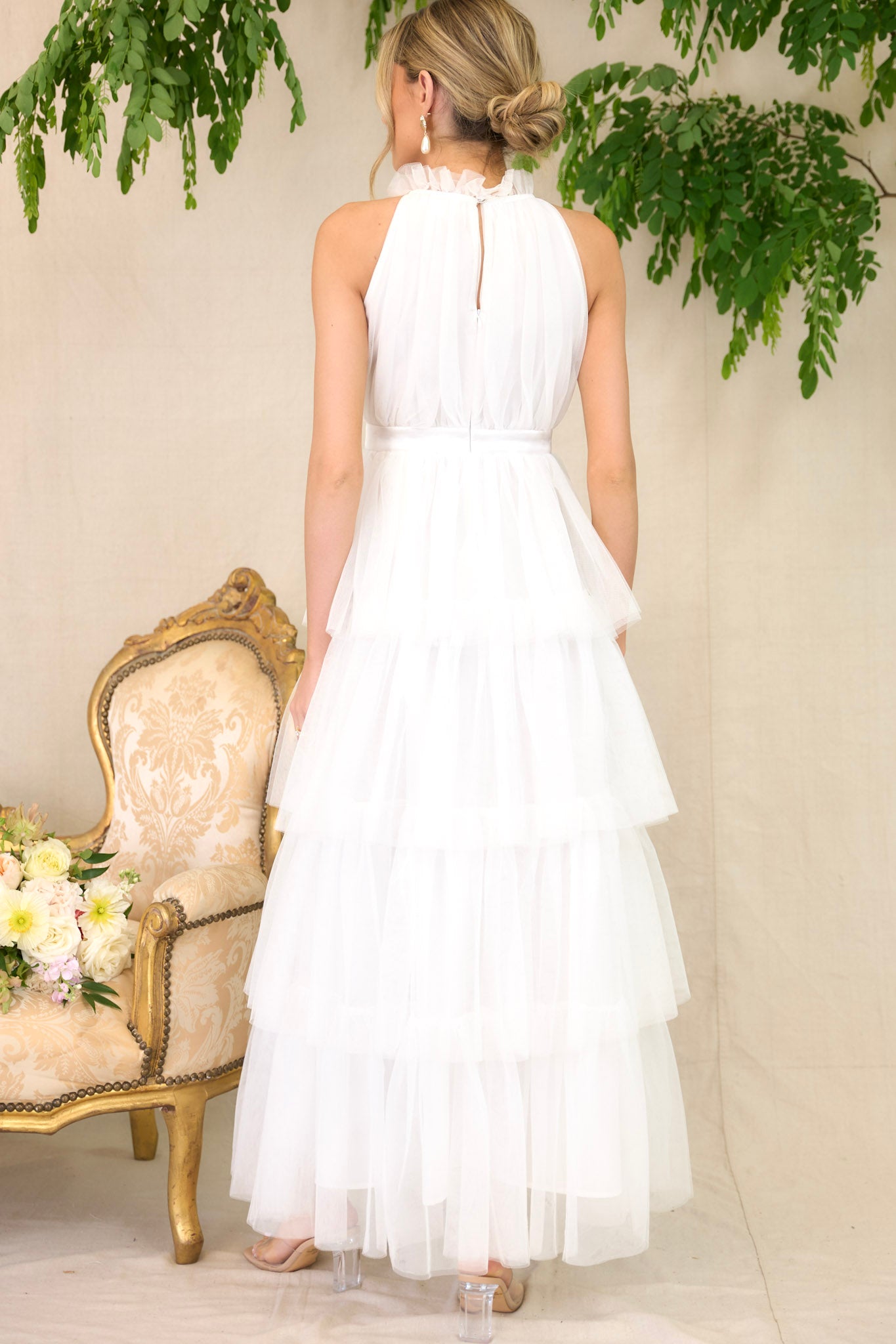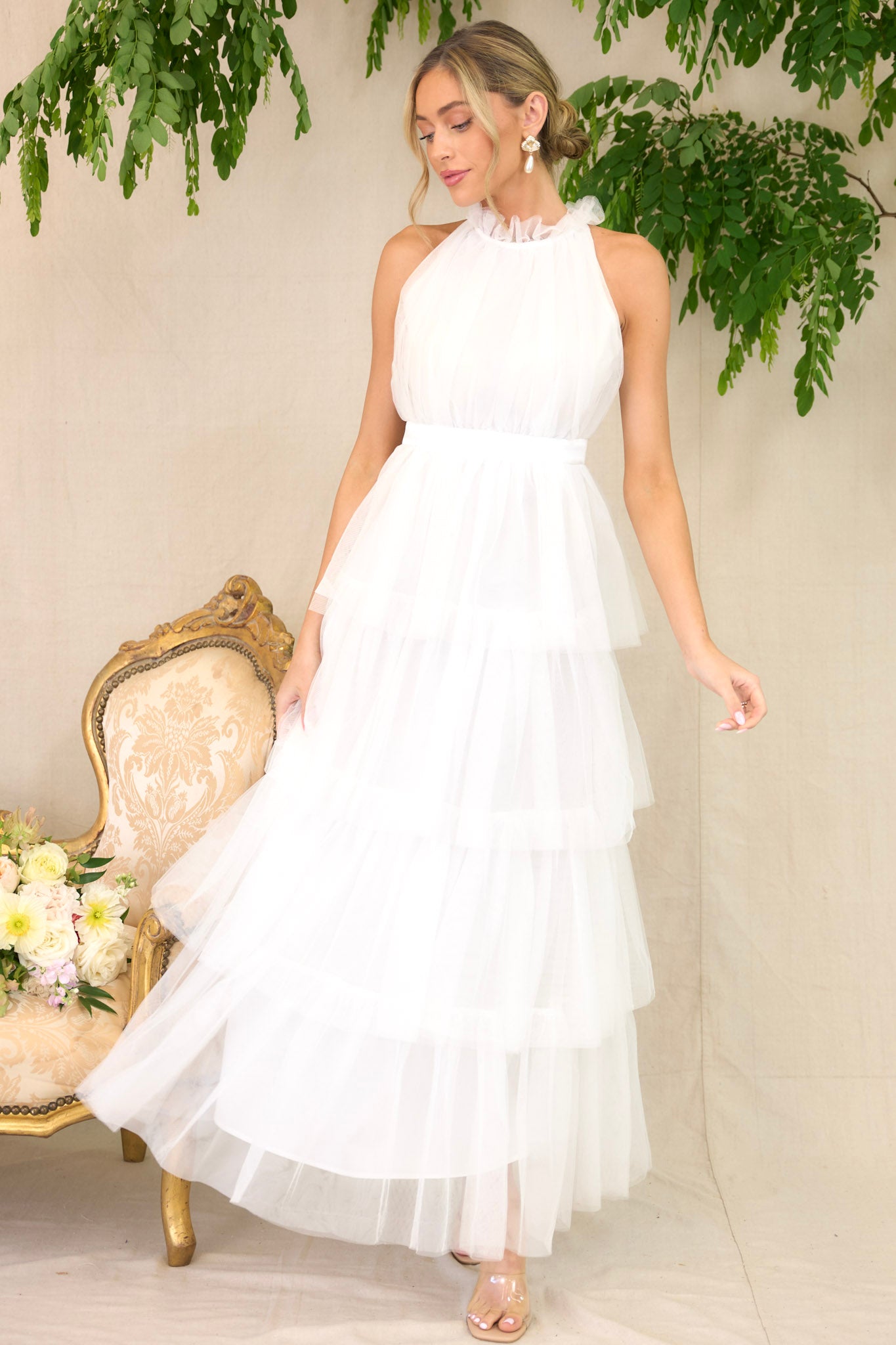 I could use a little Shock And Awe in the fashion department this season! What better way to make a stunning appearance to my next special event, than in this ruffled white maxi dress?! I love to leave them speechless when I wear a breathtaking silhouette like this pretty halter style gown! This dress features a high neckline with ruffle detailing, a button closure at the back of the neck with a keyhole cutout, a zipper in the back, and a long tiered skirt.